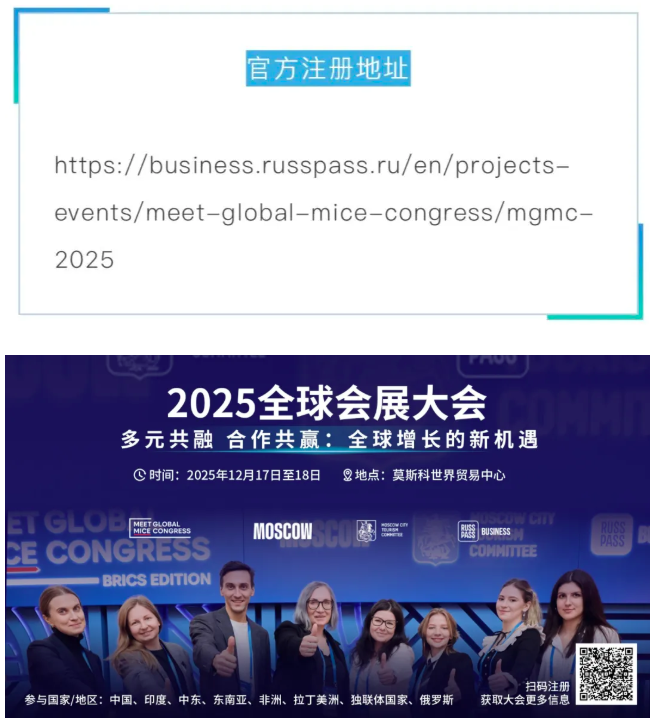 2025全球会展大会(MGMC)将于2025年12月17日至18日在莫斯科的世界贸易中心举行,汇聚全球顶尖的MICE行业专业人士、策划者和行业专家。作为连续第三年举办的盛会,这一具有重要影响力的活动将成为BRICS国家及全球南方地区代表的重要交流平台,为与会者提供一个充满活力的合作、网络构建和知识交流的环境。