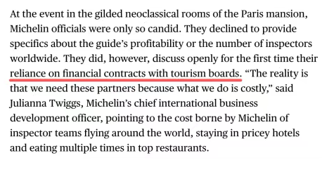 为维持庞大的评审体系,米其林也首次公开承认,与部分目的地旅游局存在资金合作。