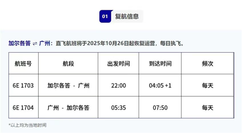 在中印直航中断五年后,印度靛蓝航空(IndiGo)率先宣布,2025年10月26日起,恢复加尔各答-广州的直飞航线,成为首个重启中印直航的航司。