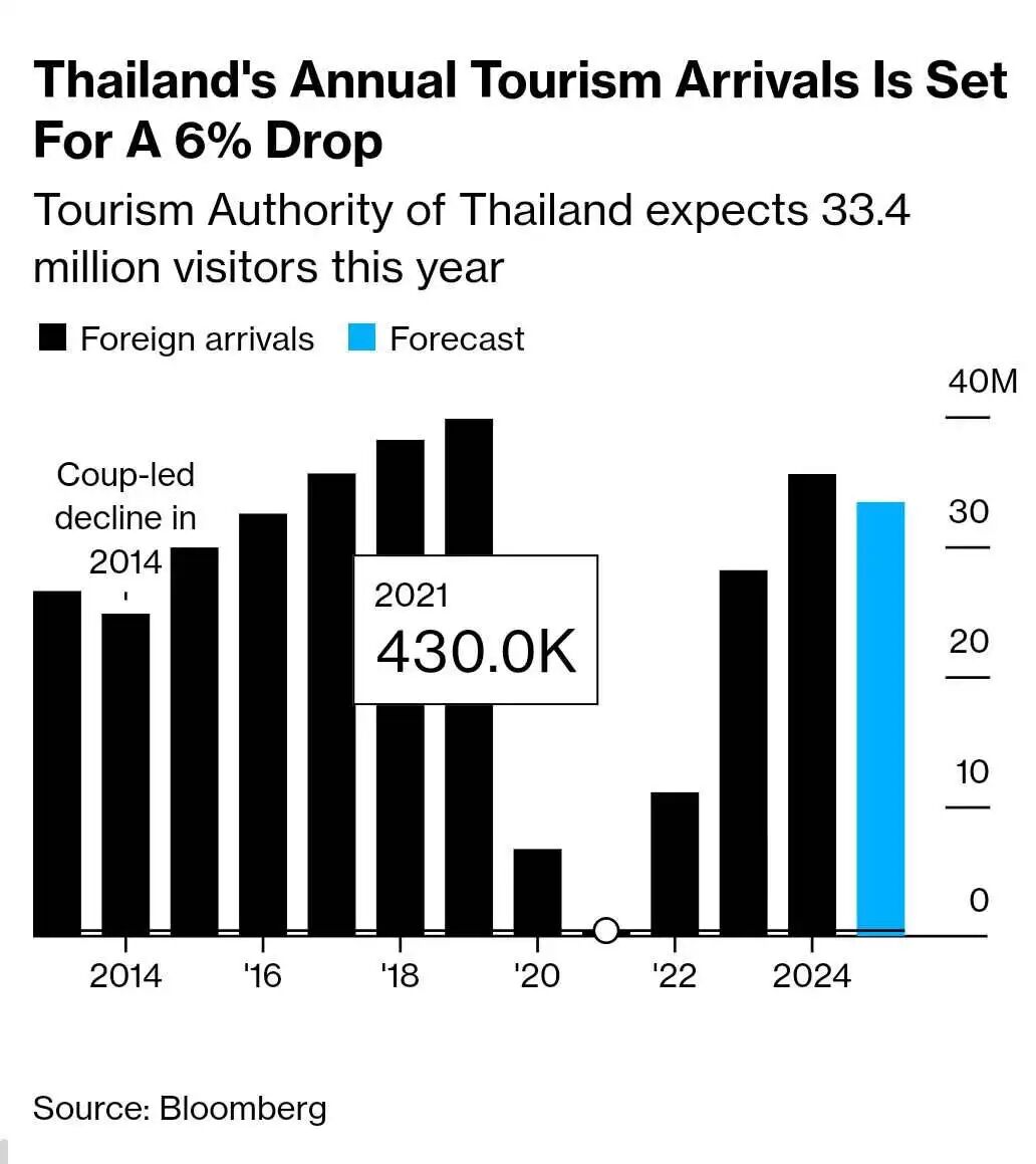 泰国旅游局最新数据预测,2025年全年游客只有3340万,比去年的3550万少了近6%,这是近四年首次下滑。