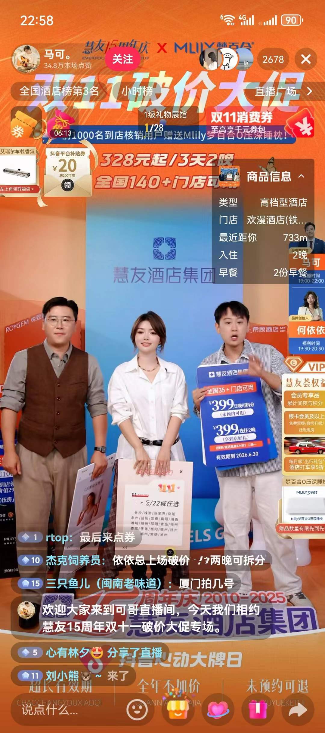 近日,一场以“舒适生活”为主题的跨界直播在抖音平台引发广泛关注。慧友酒店集团联合知名睡眠科技品牌梦百合与艺人马可,于10月30日至11月5日共同打造为期七天的系列直播活动。此次合作不仅实现了品牌资源的有效整合,更通过场景化体验与内容创新,重新定义了“舒适旅居”的当代内涵,为酒店行业的营销创新提供了新的思路。