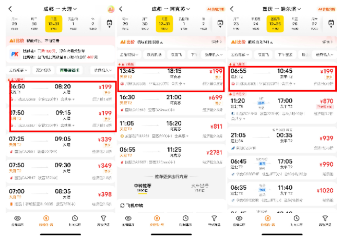 从航线网络来看,川航在成都、重庆、昆明、杭州、西安等城市布局密集,不仅覆盖大量东北、新疆等冰雪旅游热门目的地,也串联起云南、三亚等冬季“候鸟式”避寒航线。值得一提的是,以成都为中转枢纽,还可直飞稻城亚丁、博乐、阿勒泰等小众目的地,进一步拓展了“随心飞”的出行想象空间。