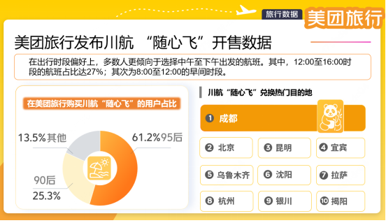(美团旅行数据显示:在已兑换的航线中,北京往返成都的航线需求火爆。)