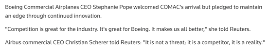 而空客商用飞机首席执行官Christian Scherer则向路透社表示:“中国商飞不是威胁,而是一个真实存在的竞争对手。”