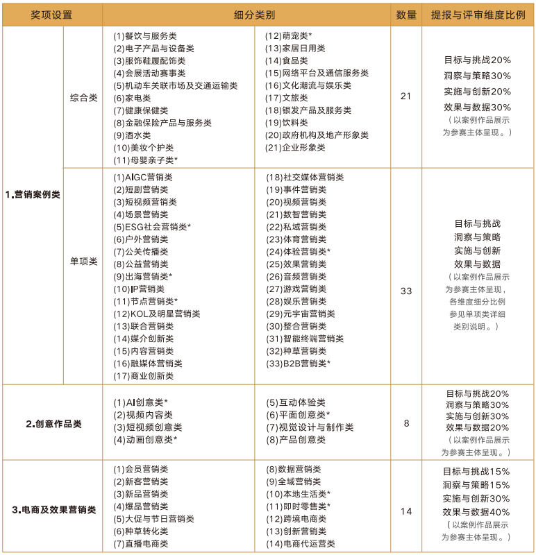 第十七届虎啸奖,共有5大类奖项设置,分别为:营销案例类、创意作品类、电商及效果营销类、技术产品类、机构人物类,5大类又细分为100+子类别设置,以下为各细分类别设置概览及具体阐释,参赛公司可根据作品属性选择合适类别进行参赛。