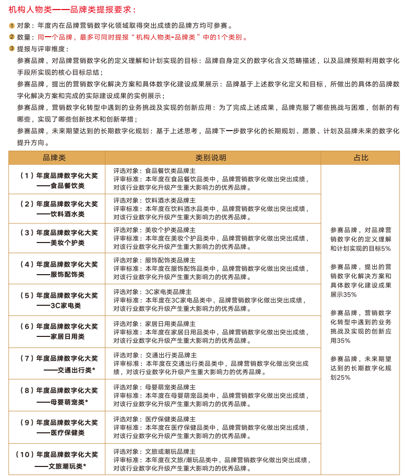 品牌类:同一个品牌,最多可同时提报“机构人物类-品牌类”中的1个类别;同一个人物,最多可同时提报“人物类”中的1个类别。