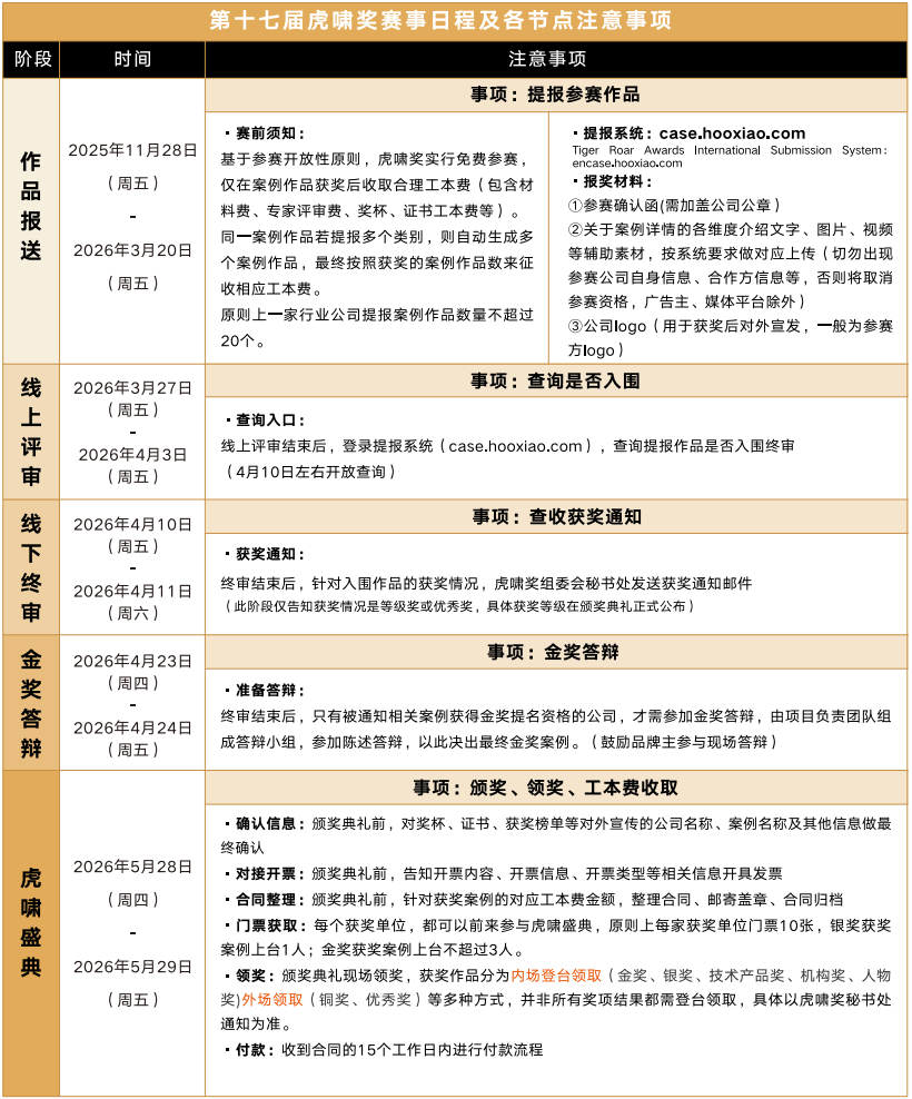 第十七届虎啸奖征赛周期为2025 年11月28日 - 2026 年3月20日,品牌企业、代理公司、技术服务商等均可登录虎啸奖官方提报系统(case.hooxiao.com),完成注册与奖项提报。