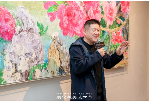 开幕式上,周春芽的经典代表作《瘦西湖的桃花》首次走出传统美术馆空间,于酒店临江的“全景画廊”中绽放。这幅被誉为“东方表现主义”桃花系列画作之一,绚烂的色彩与窗外流淌的黄浦江景交相辉映,艺术与空间、历史与当下,在此刻展开了一场流动的对话。