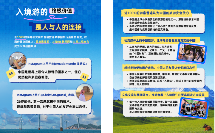 “入境游的终极价值,不止于经济增长,更在于人与人之间的真实连接。”报告中记录了许多生动的瞬间,来自俄罗斯的卡杰列夫说:“携程在北京首都机场的一站式服务柜台服务让旅程很愉快,很便捷,我还没走出机场就解决了在北京的各项安排。体验过携程“TASTE OF CHINA 味”沉浸式餐厅的外国旅客,都在社交媒体中,对于中国风的体验表达自己的喜爱。各种潮流、安心、有趣的中国体验,正在社交媒体上引发“China Cool”的全球共鸣。近100%的受访海外用户认为中国旅行安全放心,其中大多数游客还额外表达了对中国人的友善印象深刻。