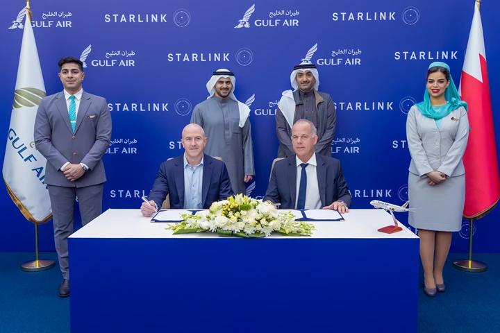 海湾航空首席执行官马丁・高斯先生与星链航空全球负责人尼克・塞茨先生在阿沃尔私人航站楼签署了此项合作协议,海湾航空集团董事长哈立德・侯赛因・塔基先生、巴林政府高层相关人士及航空业其他资深领袖共同出席了签约仪式。