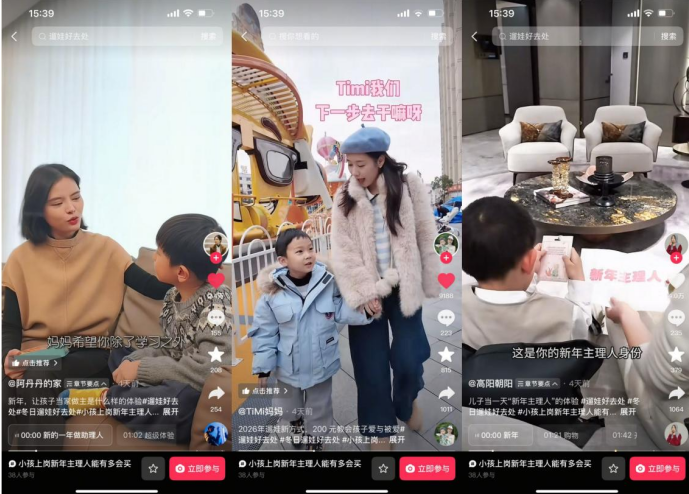 在这一生态中,热点话题成为引爆内容创作与用户参与的核心引擎。「冬日遛娃好去处」精准策划并推出一系列直击亲子互动趣点的内容标签,成功激发了达人及普通用户的共创热情。例如,购物场景下的#小孩上岗新年主理人能有多会买 ,通过展现萌娃主导家庭消费决策的趣味过程,迅速积累超32万播放量,生动传递了亲子购物的情感价值与决策新趋势。在酒店场景,话题#沉浸式感受人类幼崽酒店测评 以孩子们天真烂漫的第一视角“测评”住宿体验,相关视频播放量突破34万,为酒店商家提供了极具说服力的口碑背书与场景化展示。