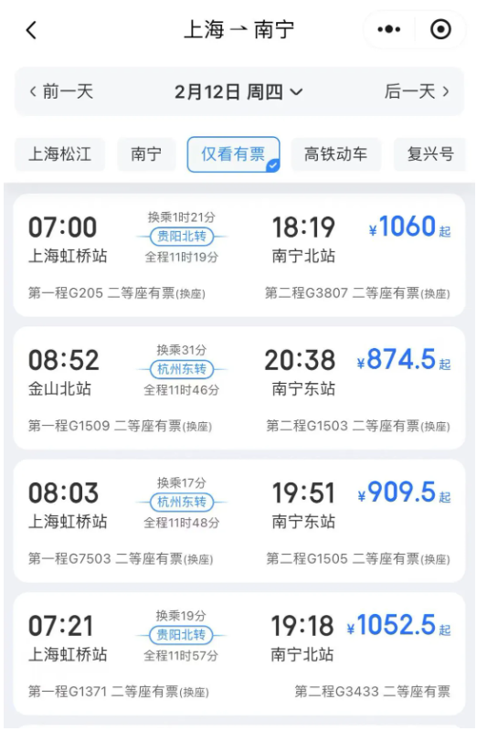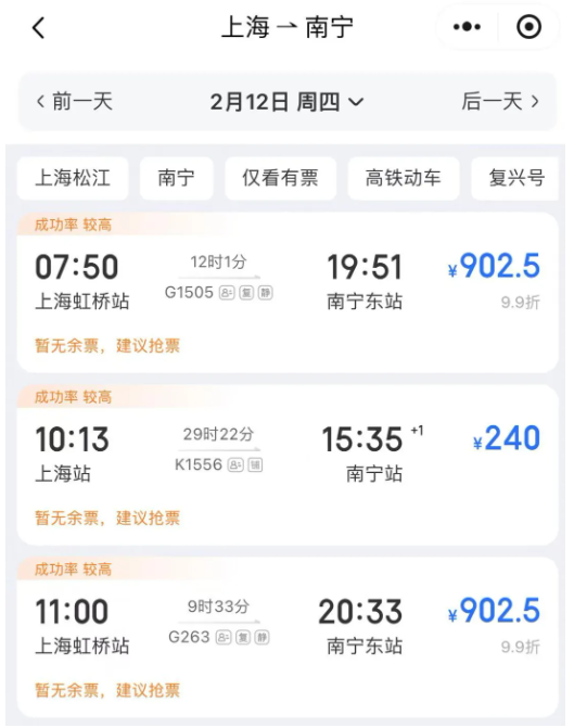 以上海至南宁为例,尽管日常有数趟直达高铁,但春运期间车票紧张,部分热门时段直达车次开售即售罄。