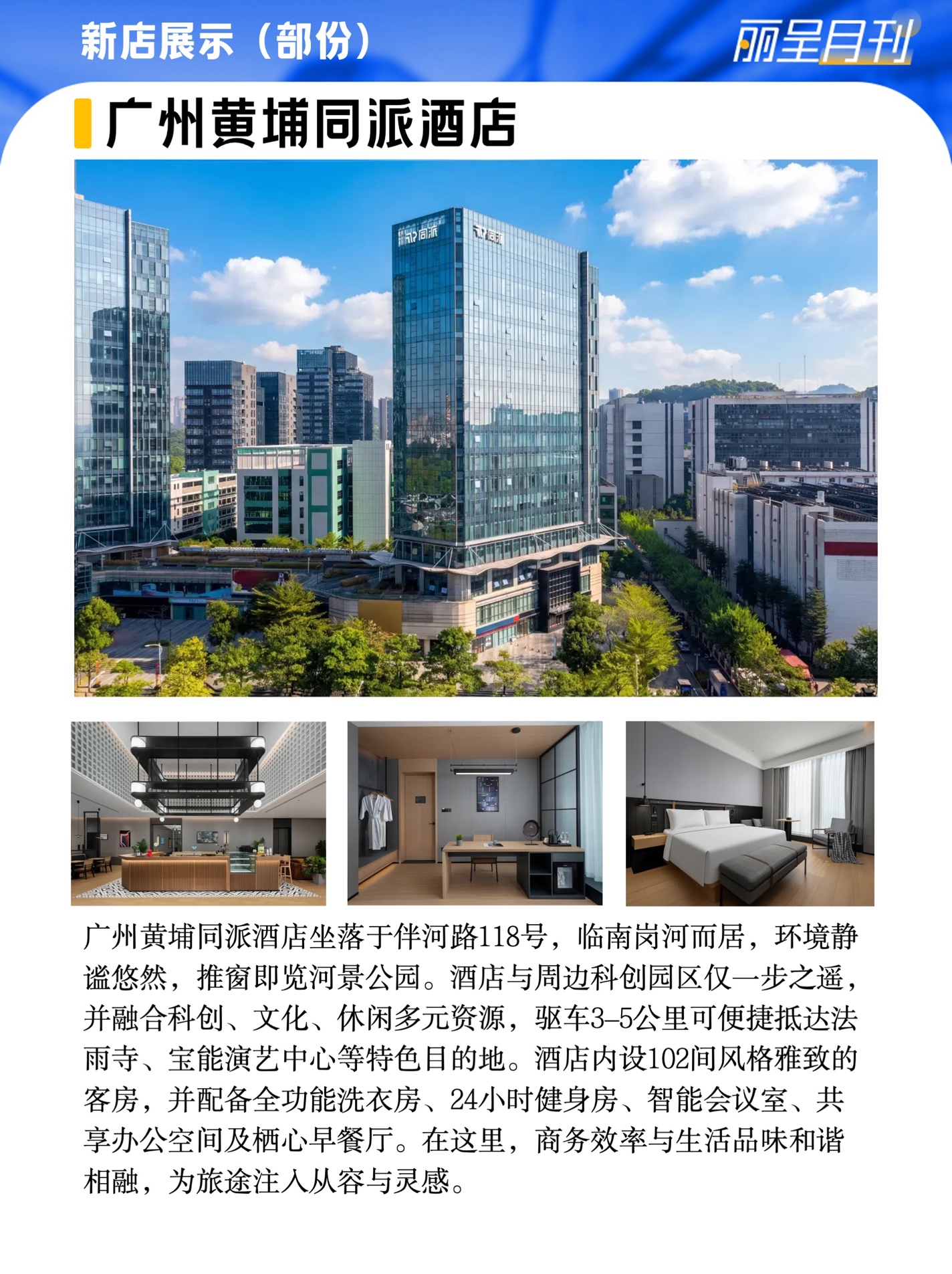 广州黄埔同派酒店坐落于伴河路118号,临南岗河而居,环境静谧悠然,推窗即览河景公园。酒店与周边科创园区仅一步之遥,并融合科创、文化、休闲多元资源,驱车3–5公里可便捷抵达法雨寺、宝能演艺中心等特色目的地。酒店内设102间风格雅致的客房,并配备全功能洗衣房、24小时健身房、智能会议室、共享办公空间及栖心早餐厅。在这里,商务效率与生活品味和谐相融,为旅途注入从容与灵感。