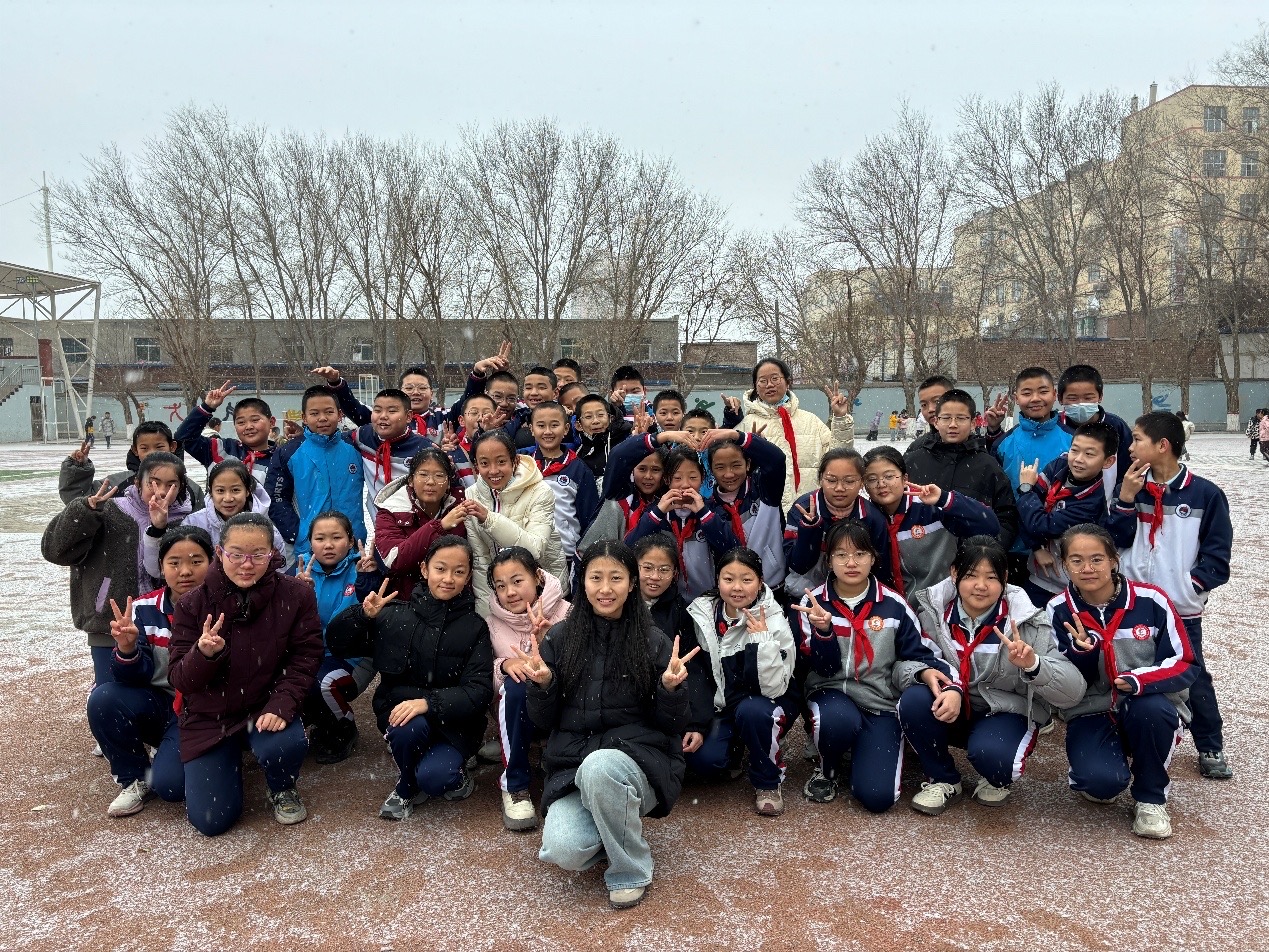 远方带来的体验是独一无二的。在重庆长大的雷艺,一直没机会亲眼见到下雪。没想到,她人生中的第一场雪,在哈密的校园里悄然降临。那天第二节课下课后,天空开始飘起小雪,雷艺照常带着学生们做课间操,雪却越下越大,“就是从天上活生生下来的那种感觉”。课间操结束后,雷艺和班上的孩子们拍了一张合影,对她而言,这张照片格外珍贵。只要想到下学期结束后要和自己的学生们分别,雷艺和朱俊就会感到难过。