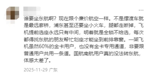 有乘客吐槽,东航如今的体验堪比“廉航”,选座受限、贵宾通道缺失、摆渡车绕路等问题屡见不鲜,这样的服务水平,很难留住高端国际旅客。