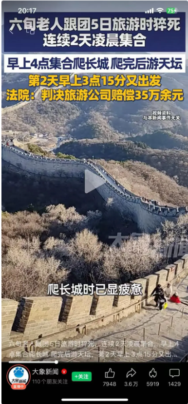 比如前段时间,北京市第二中级人民法院审结的一起老年人跟团游猝死纠纷案件中:
