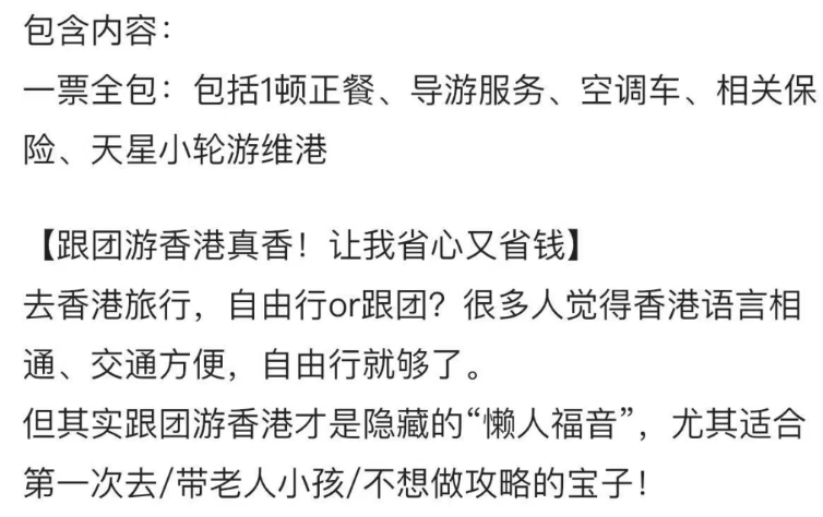 大致瞄了一眼,这类产品行程几乎雷同,从深圳莲塘口岸出发,乘坐大巴一天打卡完香港所有热门景点,包括黄大仙祠、西九龙公园、金紫荆广场、太平山顶、维多利亚港等。