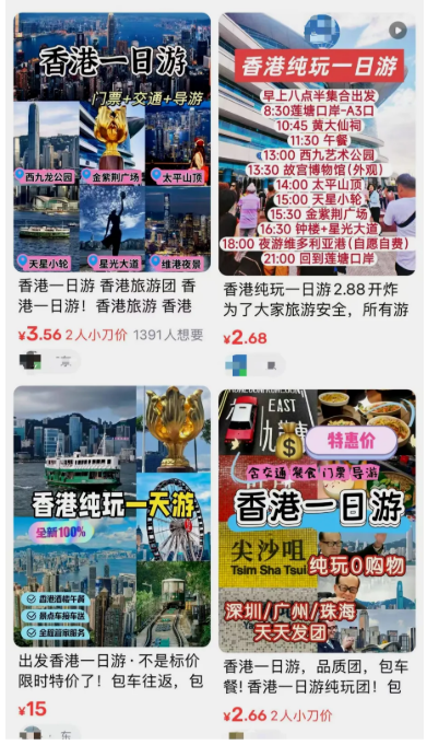 最近几个月,在某二手平台上,冒出了大量低价香港一日游产品,价格从两三块十几块不等,每天都发团。