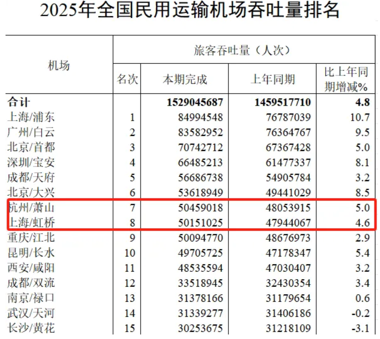 在长三角出行圈里,虹桥机场的空铁联运、高频国内航线早已是“效率代名词”,如今却被萧山机场实现了实打实的流量反超。