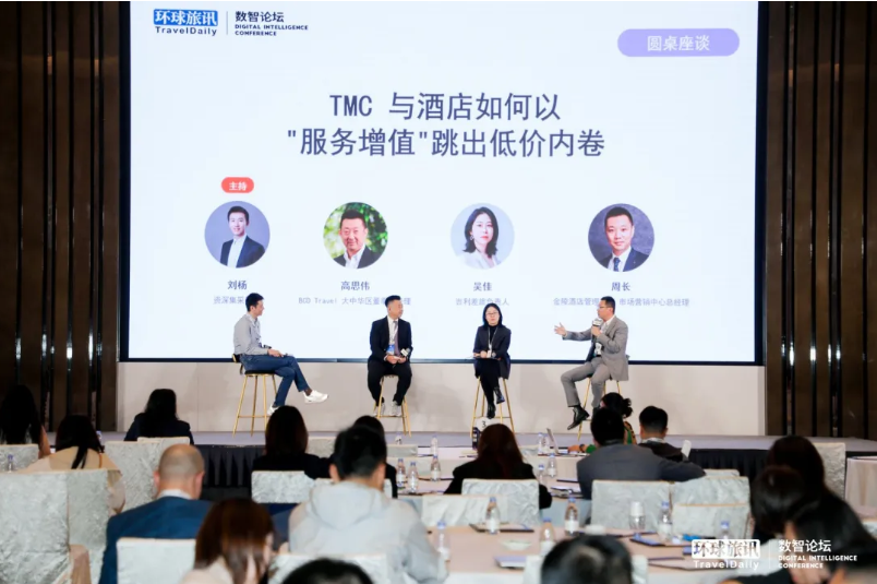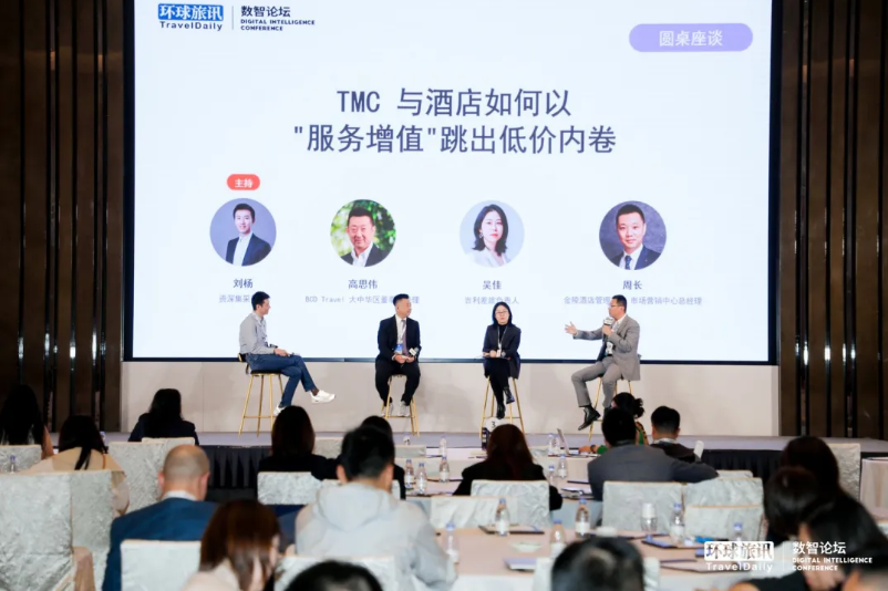 随后,刘杨再次主持《TMC与酒店如何以服务增值跳出低价内卷》圆桌讨论,携手BCD Travel大中华区董事总经理高思伟、吉利差旅负责人吴佳、金陵酒店管理公司市场营销中心总经理周长,围绕行业核心命题展开深度探讨:
