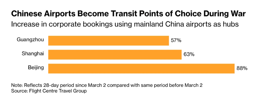 Flight Centre 数据显示,越来越多旅客选择中国航空枢纽,作为澳洲往返欧洲及其他长途目的地的中转点。