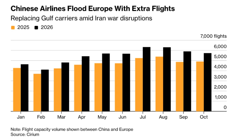 Cirium数据显示,今年夏季中国飞往欧洲的航班数量同比增长约 20%,成为亚欧长途航线的核心承接者。