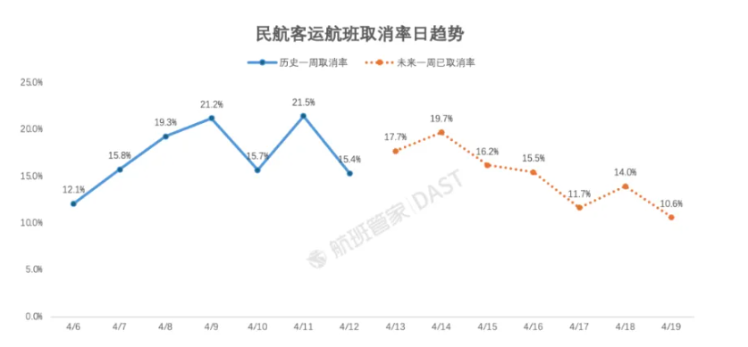 航班管家 DAST 数据显示,截至4月12日,未来一周(4.13-4.19)全国民航客运航班取消率已达15.1%,环比前一周虽回落2个百分点,而这只是当前计划取消率,随着时间推移,取消率还会继续上升。