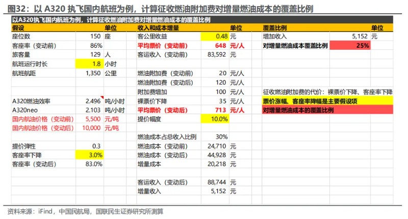 • 但在实际运营中,由于下游提价传导有限,航司需要在旅客量下滑和含附加费全票价提升之间寻求平衡,征收附加费对增量成本的净覆盖比例约为20%-30%。