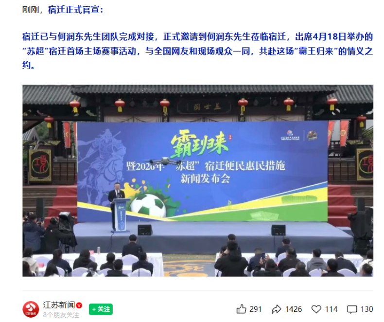 最近,宿迁文旅官宣了何润东将出席“苏超”宿迁首场主场赛事。