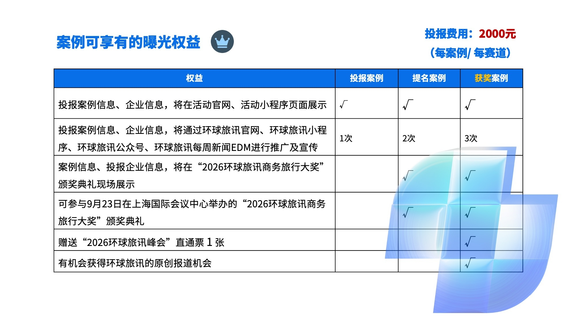 在信息繁杂、产品多样的现状下,“2026 环球旅讯商务旅行大奖”致力于构建“权威性+实用性”的双重评价坐标系,为企业采购负责人和商务旅行者提供清晰的选择参考。投报本奖项,就是让您的品牌直接进入企业差旅采购决策者的“必选清单”。