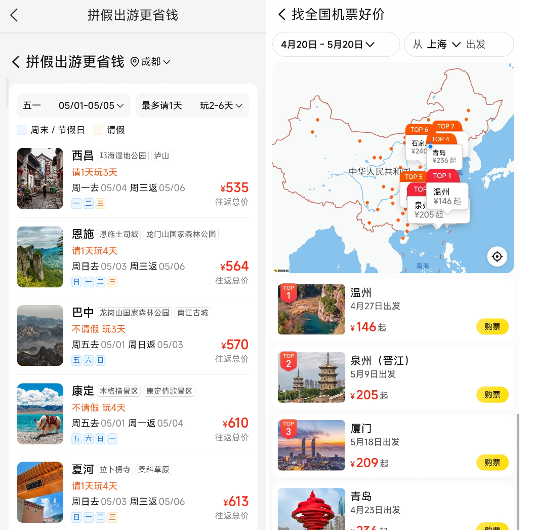 基于假期出行成本考虑,不少人会将高性价比机票作为决策关键,甚至“哪里机票便宜去哪里”。记者注意到,美团近期上线了“全国低价机票地图”,用户可一览各热门目的地的低价机票,快速锁定行程;此前,美团已上线“全网比价”“降价必赔”等服务保障,预订带有“降价必赔”标识的机票,若同一航班票价在预订到起飞期间内降价,可获得差额赔偿。