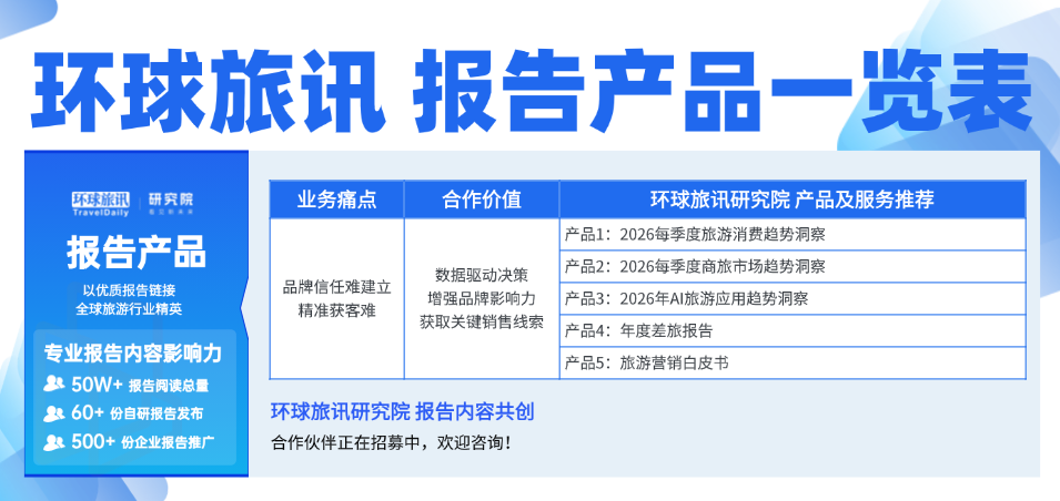 环球旅讯研究院依托环球旅讯在旅游业深耕多年的行业资源与数据洞察能力,围绕旅游消费与品牌、商旅、智慧旅游、企业出海等核心方向,定期发布行业研究报告、白皮书、竞争力榜单、发展指数等深度内容产品。