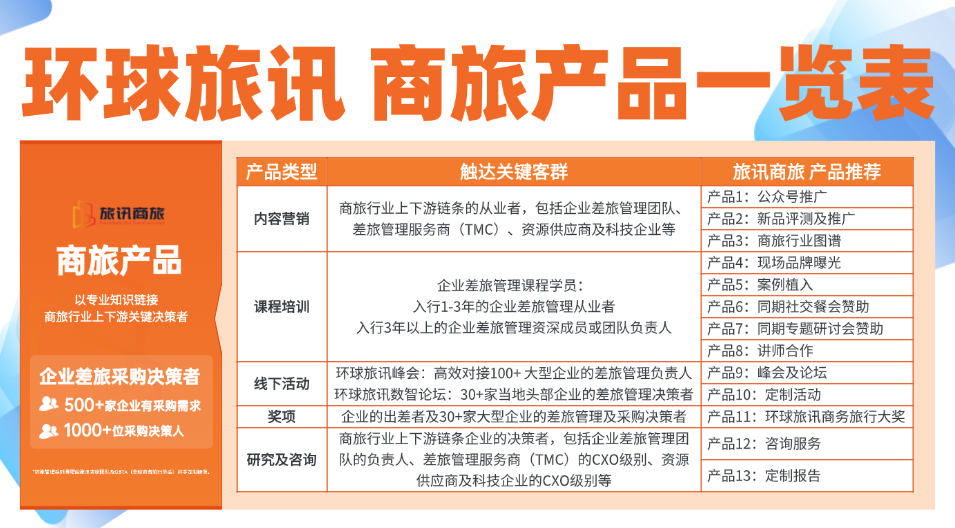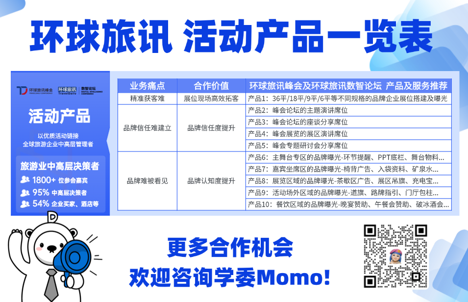 选择环球旅讯,全球旅游业顶级盛会,一次性收割高质量线索 → 论坛分享 + 展位展示 + 闭门研讨会+晚宴社交等全链路精准触达1800+位旅游企业中高层,避免无效社交,直接精准拓客。