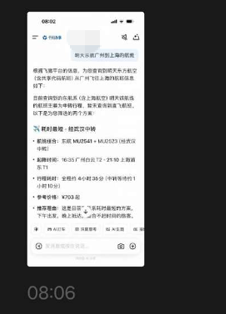 A总想用某大模型查明天广州到上海的航班,结果 AI 一本正经地告诉他“暂未查询到直飞航班”,并热心地推荐了一个经武汉中转、耗时近 5 小时的方案,指出这是耗时最短的方案。